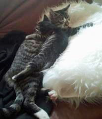 Dusty (der Brauntiger) und Shiva (graugetigert mit weiß) haben eine sehr enge Bindung, spielen und schmusen auch gerne zusammen.
