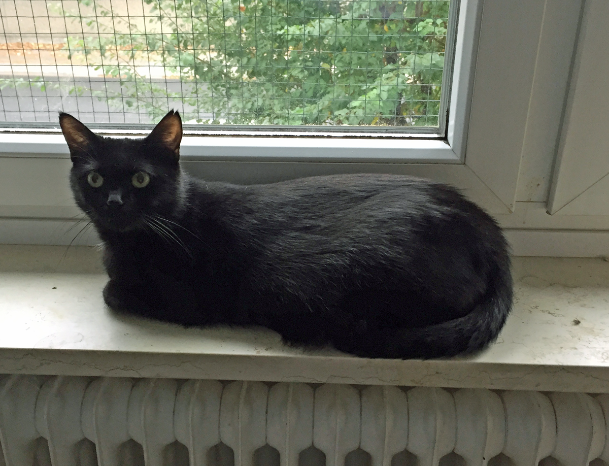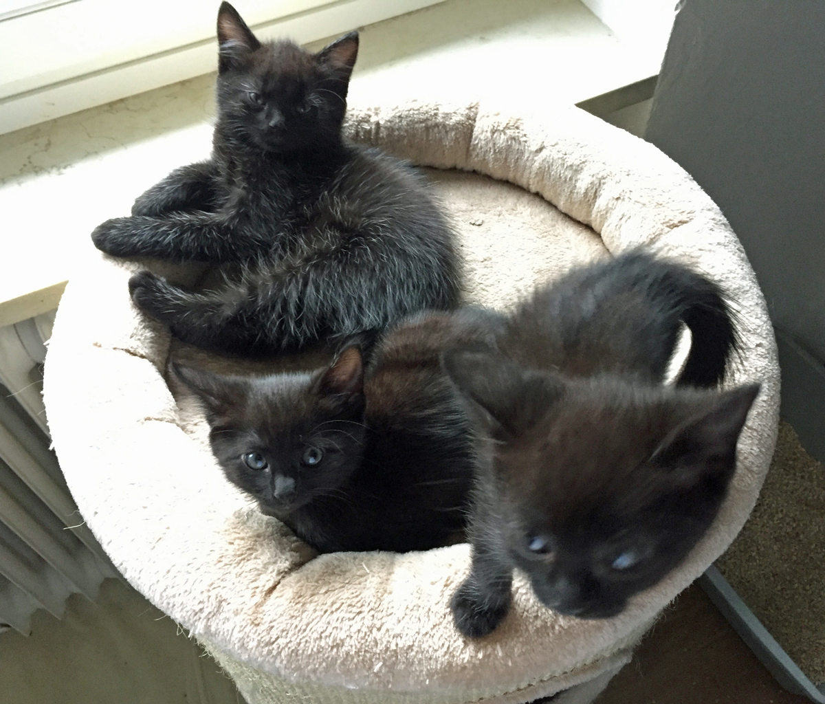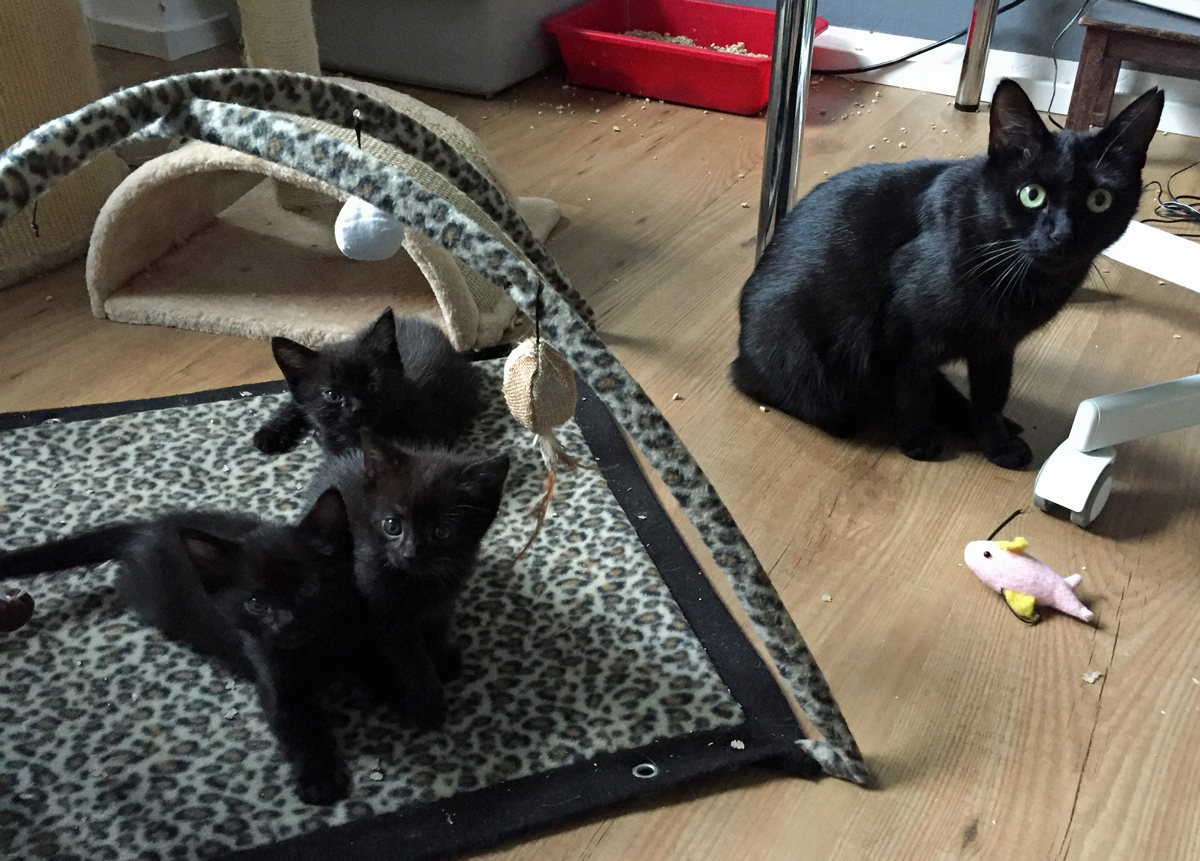 Die schwarze Katzenmama hat ihre Kinder (zwei Mädchen und ein Bub) auf einer Terrasse auf die Welt gebracht und wurde von uns in Pflege genommen.