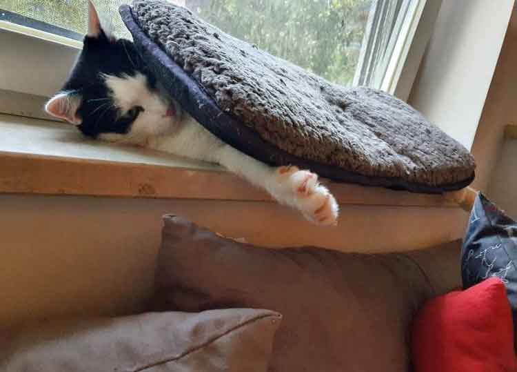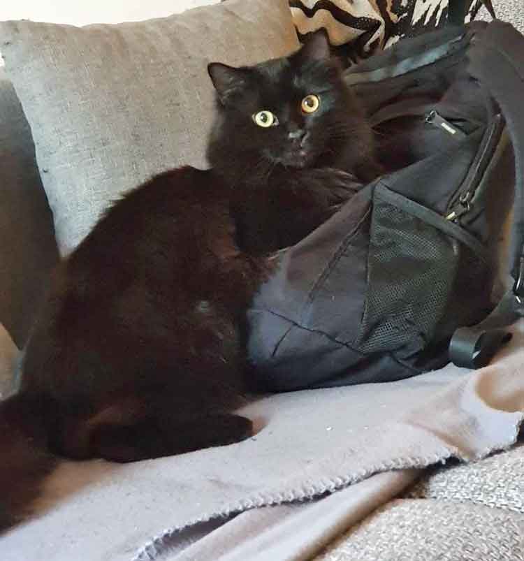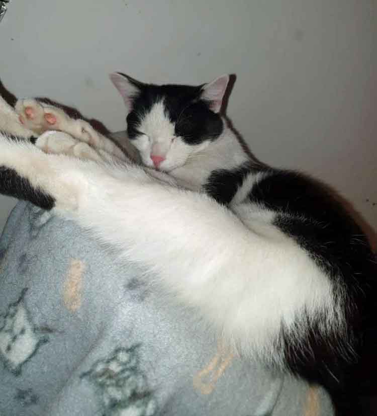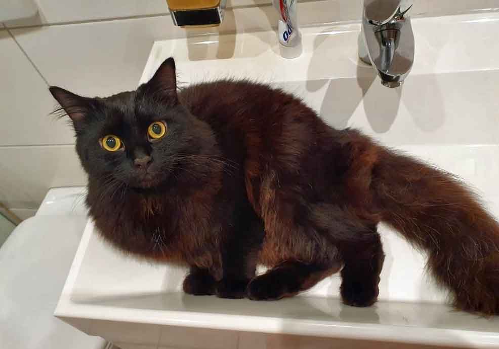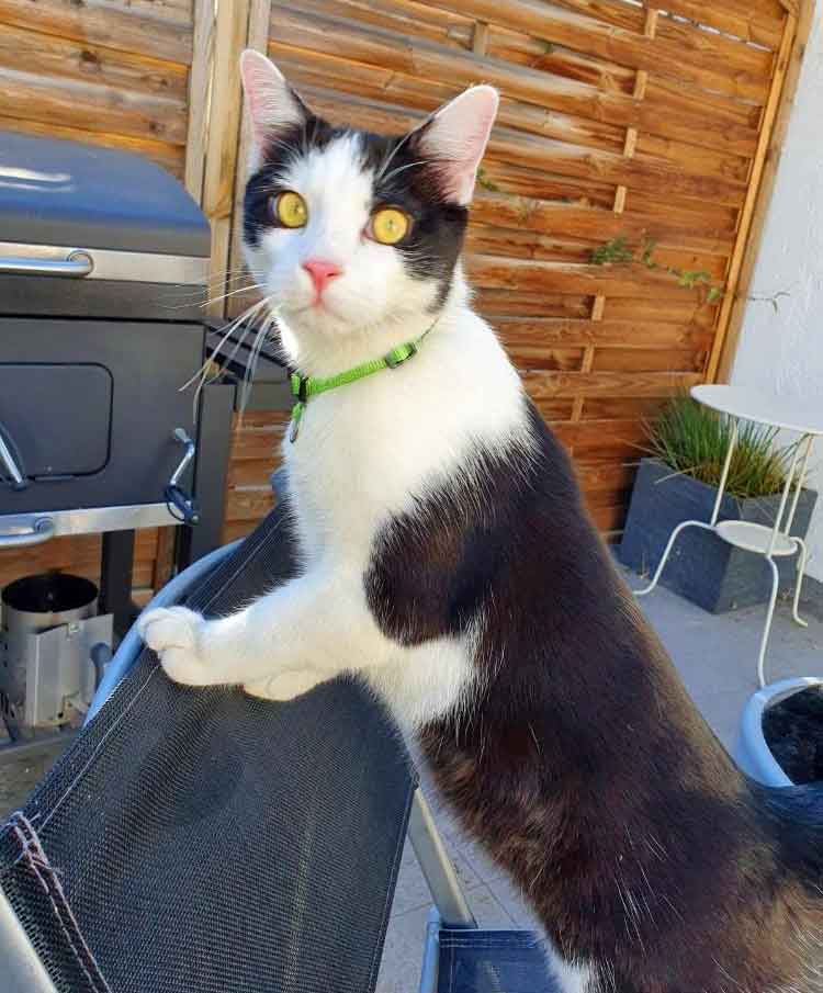 Muffin, die Kätzin ist eher die Ruhigere von beiden. Sie kuschelt und spielt aber gerne. Sie kann sich nie genau entscheiden, mit wem sie gerade lieber kuscheln möchte und wandert deshalb von Person zu Person. Sie isst sehr gerne ( um nicht zu sagen, sie ist verfressen…). Sie ist sehr zuverlässig und treu. Draußen geht sie nie weit weg und kommt regelmäßig heim, sie ist lieber drin als draußen.