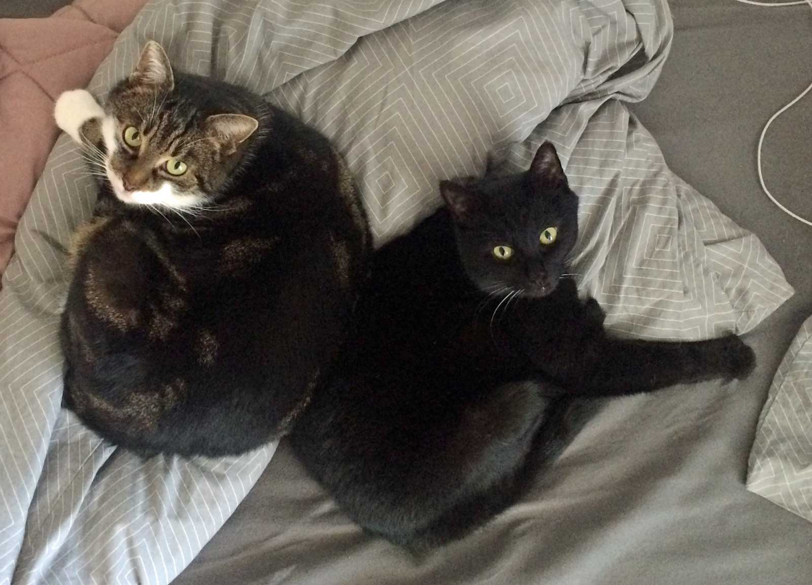 Die beiden Kater Sami (schwarz, 10 Jahre) und Simba (getigert, 8 Jahre) suchen gemeinsam ein neues Zuhause.