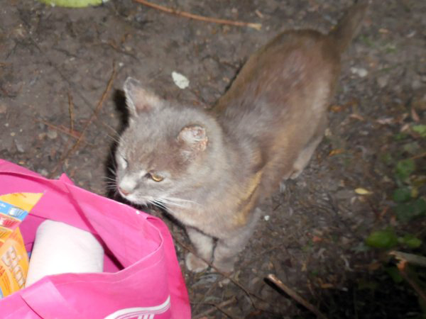 Niemand kannte mich, niemand liebte mich. Als ich schon ganz mager und geschwächt war, erschnupperte ich hier irgendwo den Duft von Essen. Katzen-Essen! Da stehen Futterhäuser mit Tellern voller Köstlichkeiten, nicht weit davon 8 Schlafhäuser voll mit Stroh. Hier wurde ich endlich sesshaft und streiche der Betreuerin so oft und so fest um die Beine, dass sie schließlich meinen Teller als erstes herrichtet. Ich habe immerhin den größten Hunger. Es macht sowieso keinen Sinn, den anderen vorher die Teller zu füllen, ich hole mir von jedem Teller das Beste, und dann laufen die anderen davon. Wenn nicht, helfe ich nach.